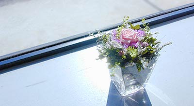 やさしい色合いのピンクのプリザーブドローズを中心に、