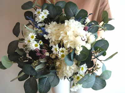 白い小花にプリザーブの紫陽花などを