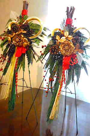 金色の大きなシダーローズを真ん中にいれた和風スワッグ。