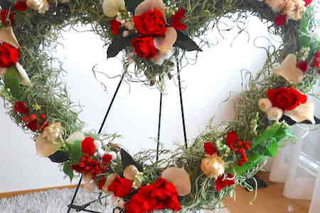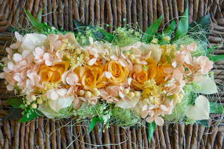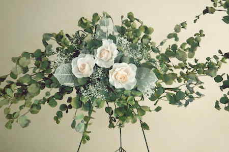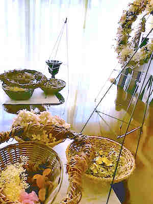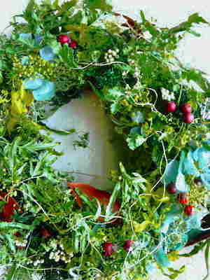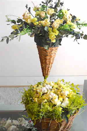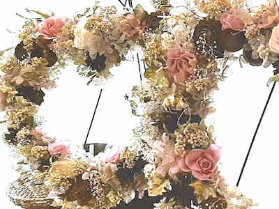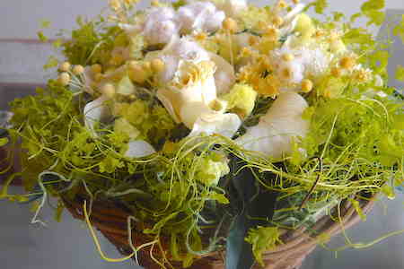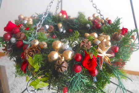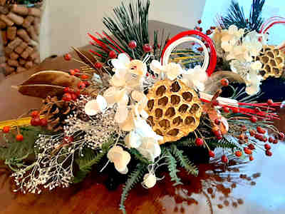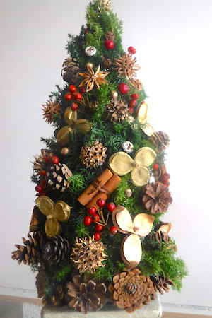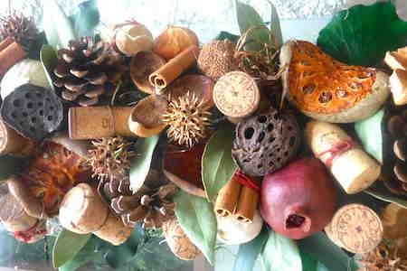 金色のハスの実や藪椿、松ぼっくりなどの木の実、