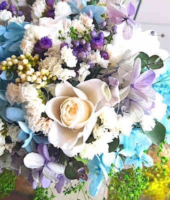 白のプリザーブの花材、アクセントにニゲラをあわせた