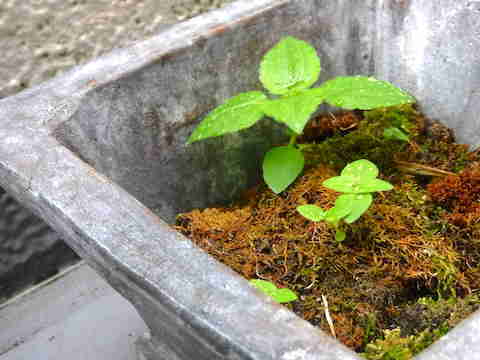 苔の鉢から小さな芽がでていました。