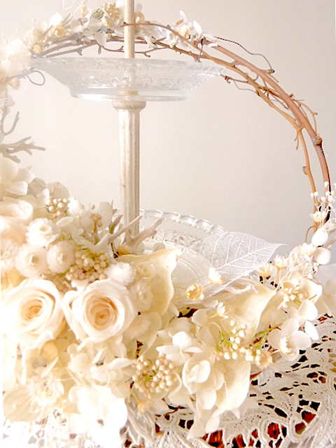 ミルクのようなやさしい色合いのリースが完成。