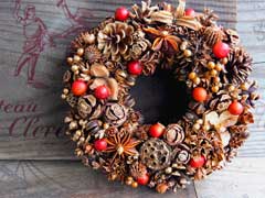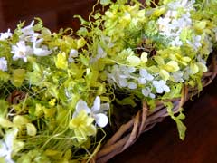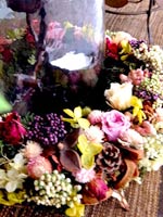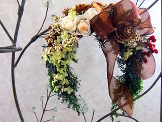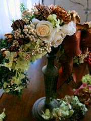アイボリーホワイトのバラやアジサイ、木の実をいれています。