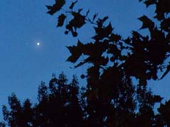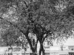 プラタナスの高い木の梢に浮かぶ、丸い木の実のシルエット。