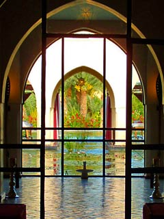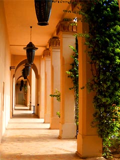 ブーゲンビリアの花咲くプールサイド、椰子の木の影。