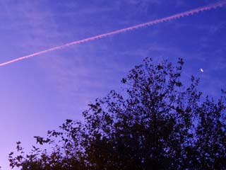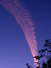 朝焼けの空に、ひこうき雲が線を描いていきます。
