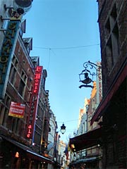 古い石畳の道路と美しい街並み、立ち並ぶ街灯。