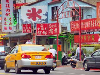 カラフルな看板にかわいい黄いろのタクシー。