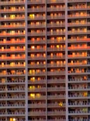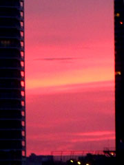 砂色の高層ビルが夕焼けに染まる瞬間の美しさ。