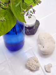 白い貝殻に青いちいさなガラスびん。