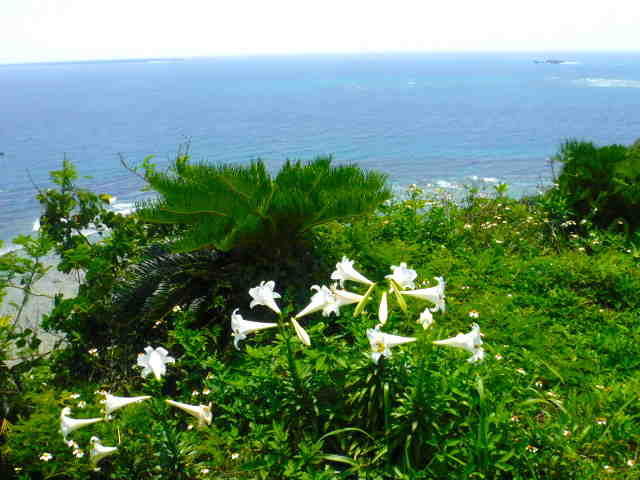 きれいな青い海と白百合の花が印象的な岬の公園に