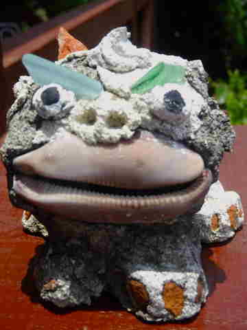 貝の口とシーグラスの眉がかわいらしいシーサーや