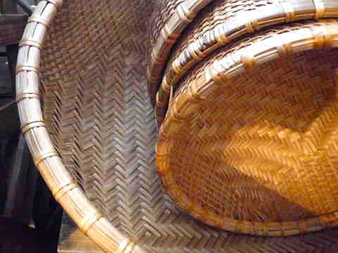切り子の青いグラスと大小の竹ざる。