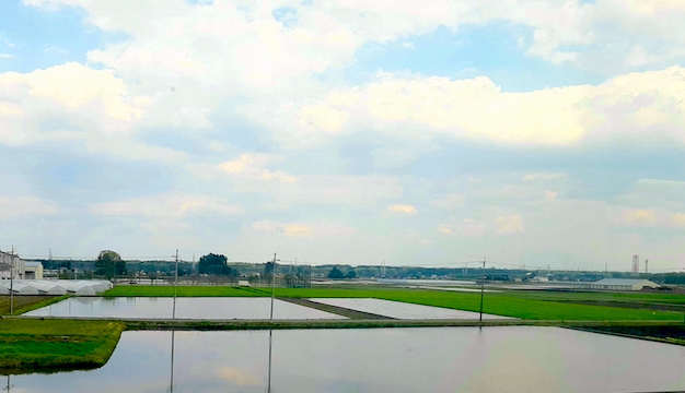 空を映してキラキラ光る水田。