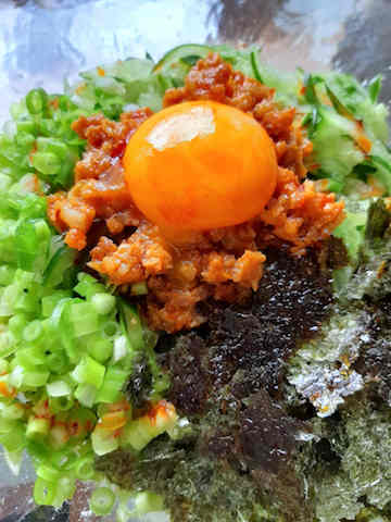 刻みネギ、焼きのり、卵黄をトッピング。